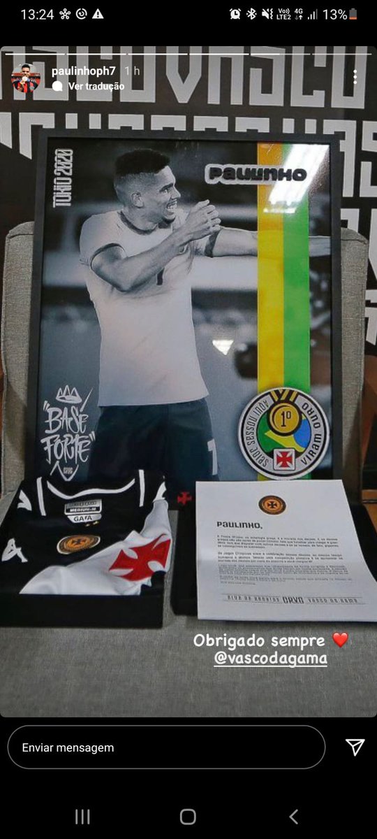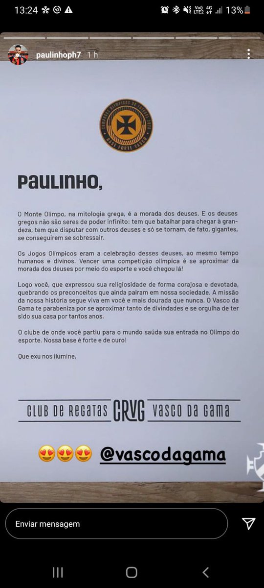 Olha só que coisa linda que o @VascodaGama mandou para o @PaulinhoPH7. Parabéns a quem escreveu o texto. Eu, daqui, fiquei emocionado. Imagina ele e a família. E a citação à frase utilizada primeiro pelo jogador é mais um momento que faz todo vascaíno ser obrigado a lutar...