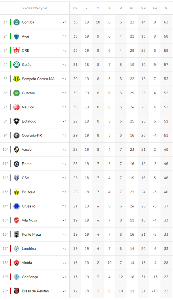 Confira a classificação do Brasileiro da Série B após os jogos desta 4ª-feira; Vasco está em 10º lugar