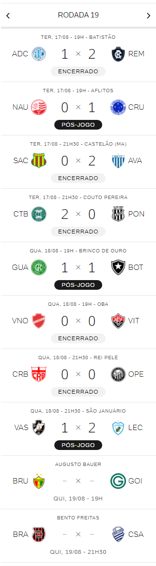Quatro jogos foram disputados nesta 4ª-feira pela 19ª rodada do Brasileiro da Série B. O Vasco, que perdeu para o Londrina por 2 a 1 em São Januário, está em 10º lugar.