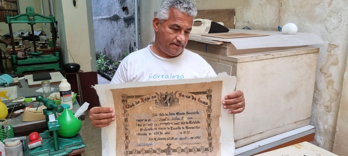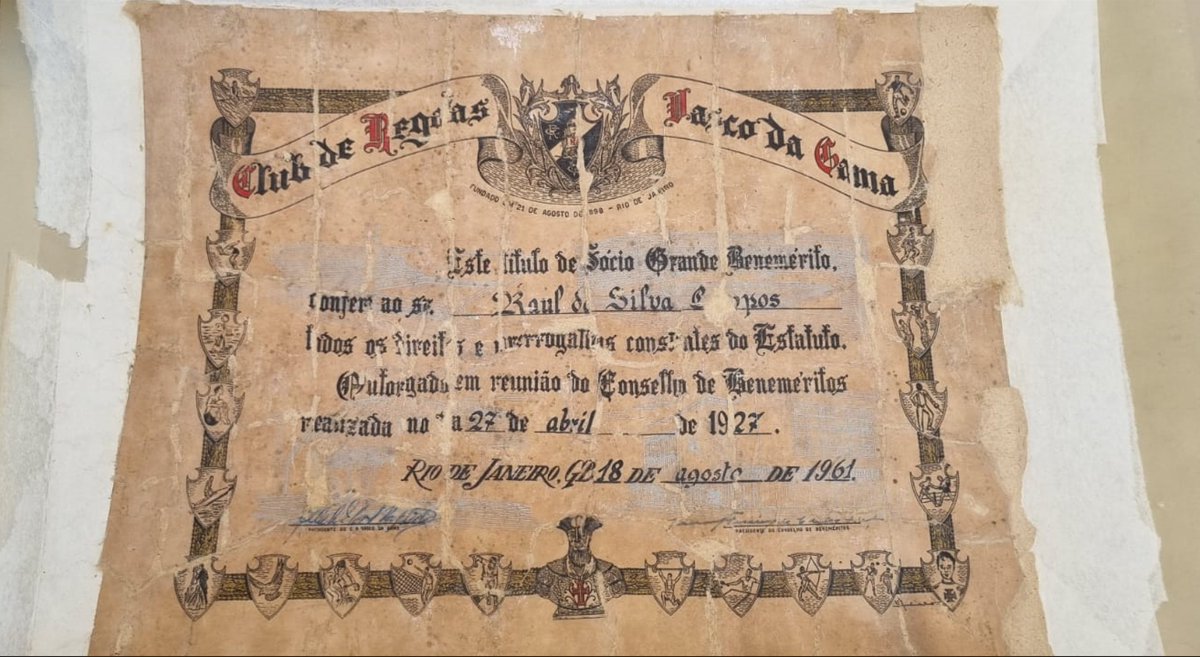 2 - Com dedicação vamos restaurando, através do amigo restaurador Edmar Gonçalves, este magnífico documento emitido pelo Vasco. Inicialmente estava degradado e colado em fita adesiva para empacotamento que foi removido.