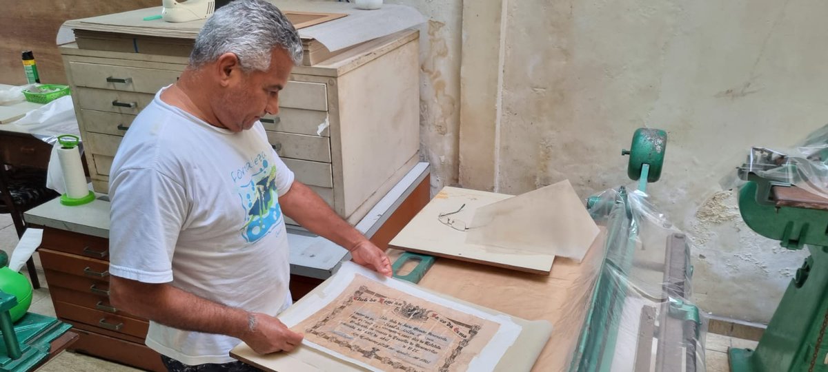 3 - Feita a remoção das camadas de fitas adesivas o documento recebeu um faceamento de papel japonês, que depois da restauração será removido após pigmentação das partes faltantes. O suporte é em papel apergaminhado.