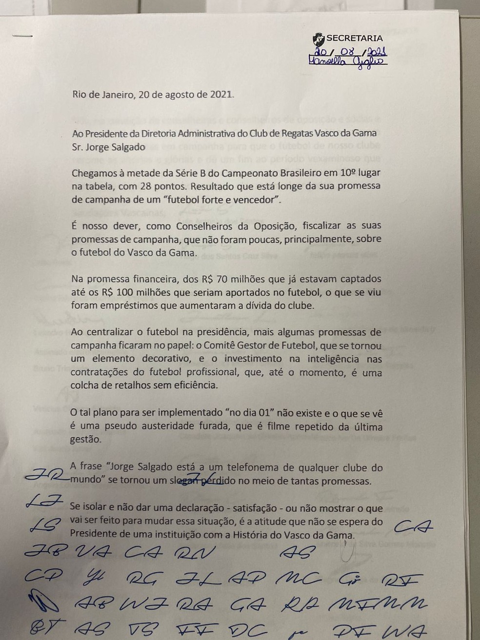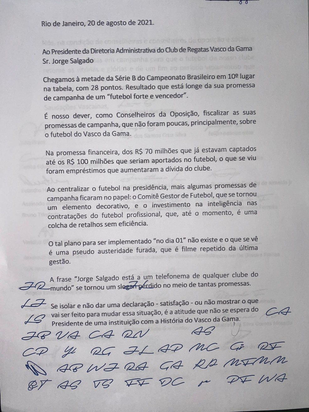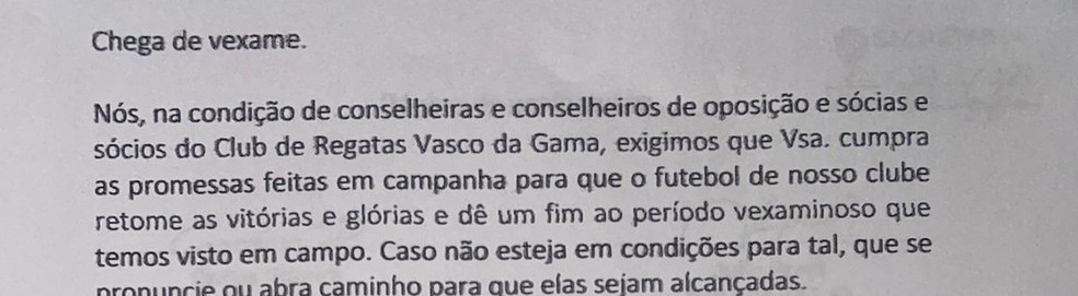 Nós, na condição de conselheiras e conselheiros de oposição e sócias e sócios do Club de Regatas Vasco da Gama, exigimos que Vsa. cumpra as promessas feitas em campanha para que o futebol de nosso clube retome as vitórias e dê um fim ao período vexaminoso que temos visto em campo. Caso não esteja em condições para tal, que se pronuncie ou abra caminho para que elas sejam alcançadas.