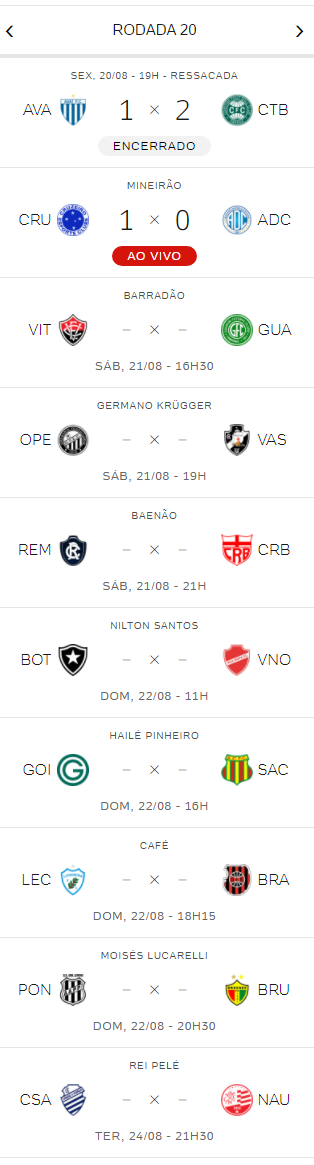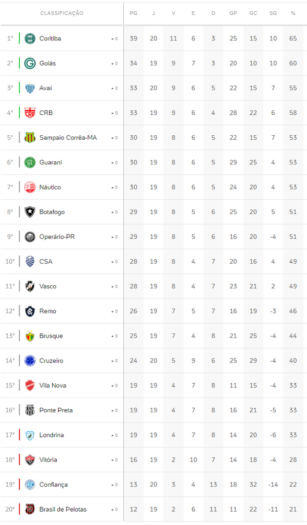 Dois jogos abriram, nesta 6ª-feira, a 20ª rodada do Brasileiro da Série B. O Vasco, que enfrenta o Operário em Ponta Grossa neste sábado, está em 11º lugar e não tem chance de terminar a rodada no G4.