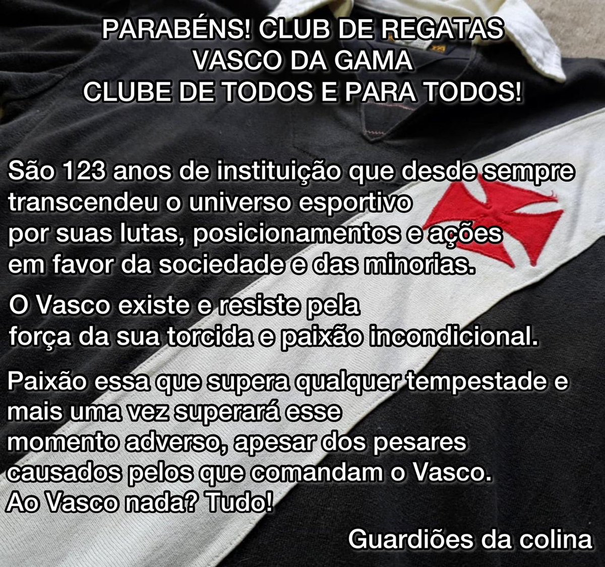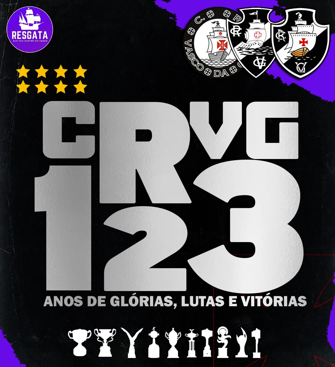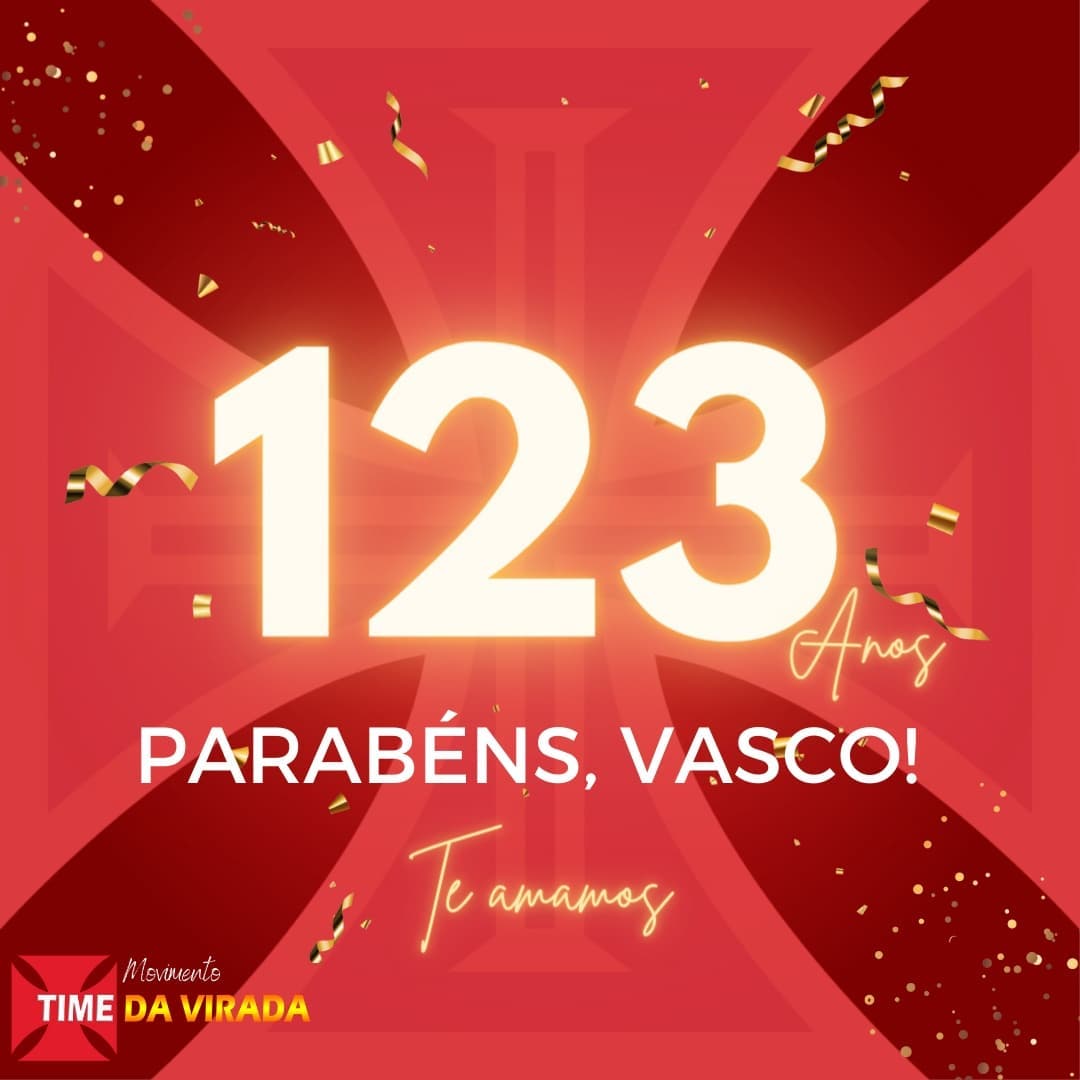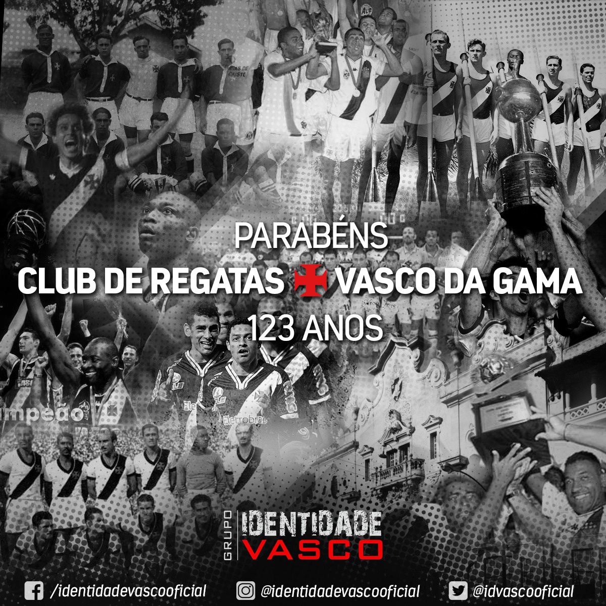 Parabéns GIGANTE! São 123 anos com a história mais bonita não só do futebol, mas de qualquer instituição. De muitas vitórias, títulos e defesa do real sentido do que é ser diferente para a sociedade. O VASCO É e SEMPRE SERÁ GIGANTE! Não só pelas 4 linhas, mas pelos triunfos HISTÓRICOS.