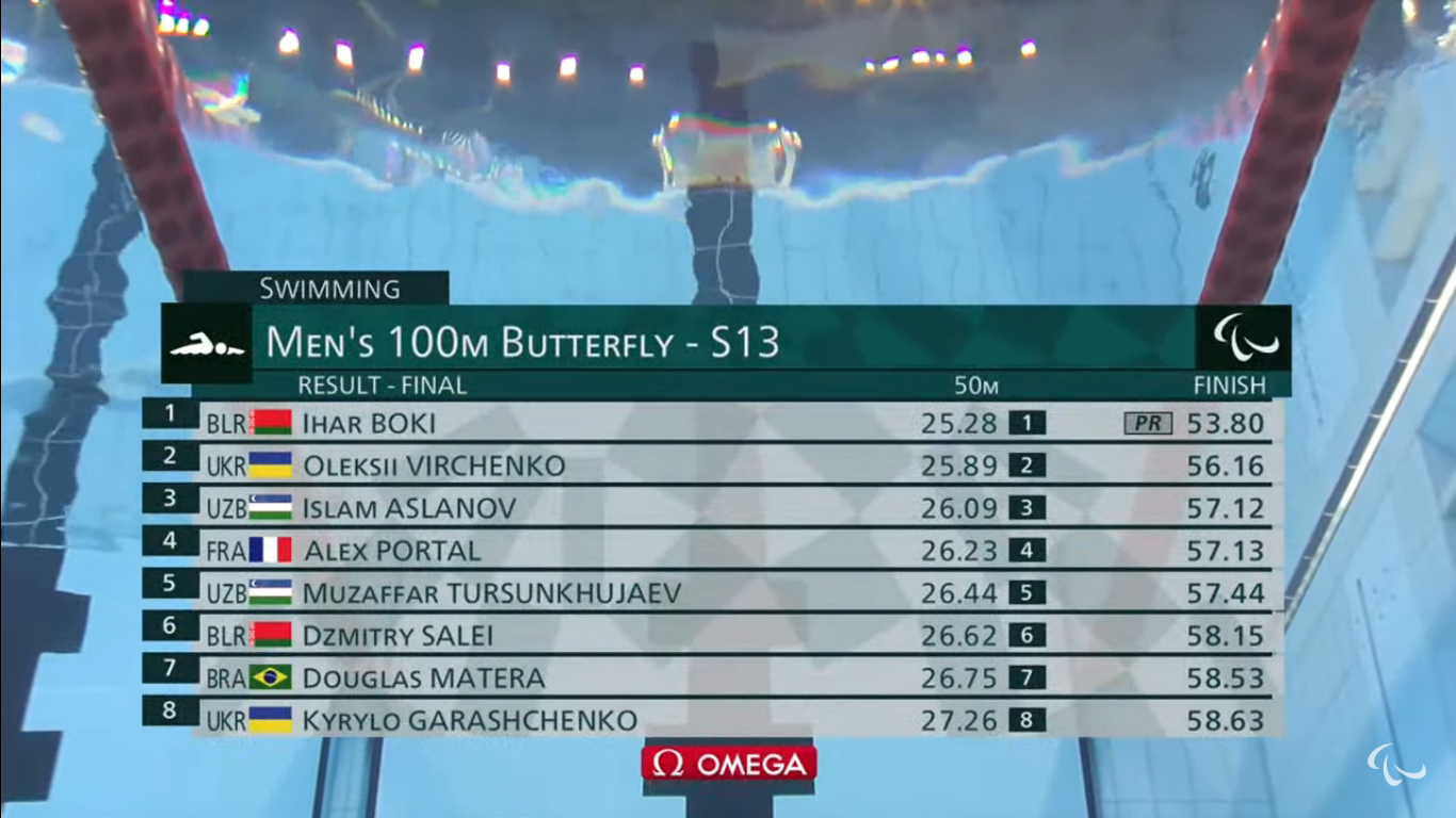 O brasileiro Douglas Matera ficou com o sétimo lugar nos 100m borboleta classe S13, com 58.53. O ouro ficou com Boki (BLR), a prata com Virchenko (UCR) e bronze com Aslanov (UZB).