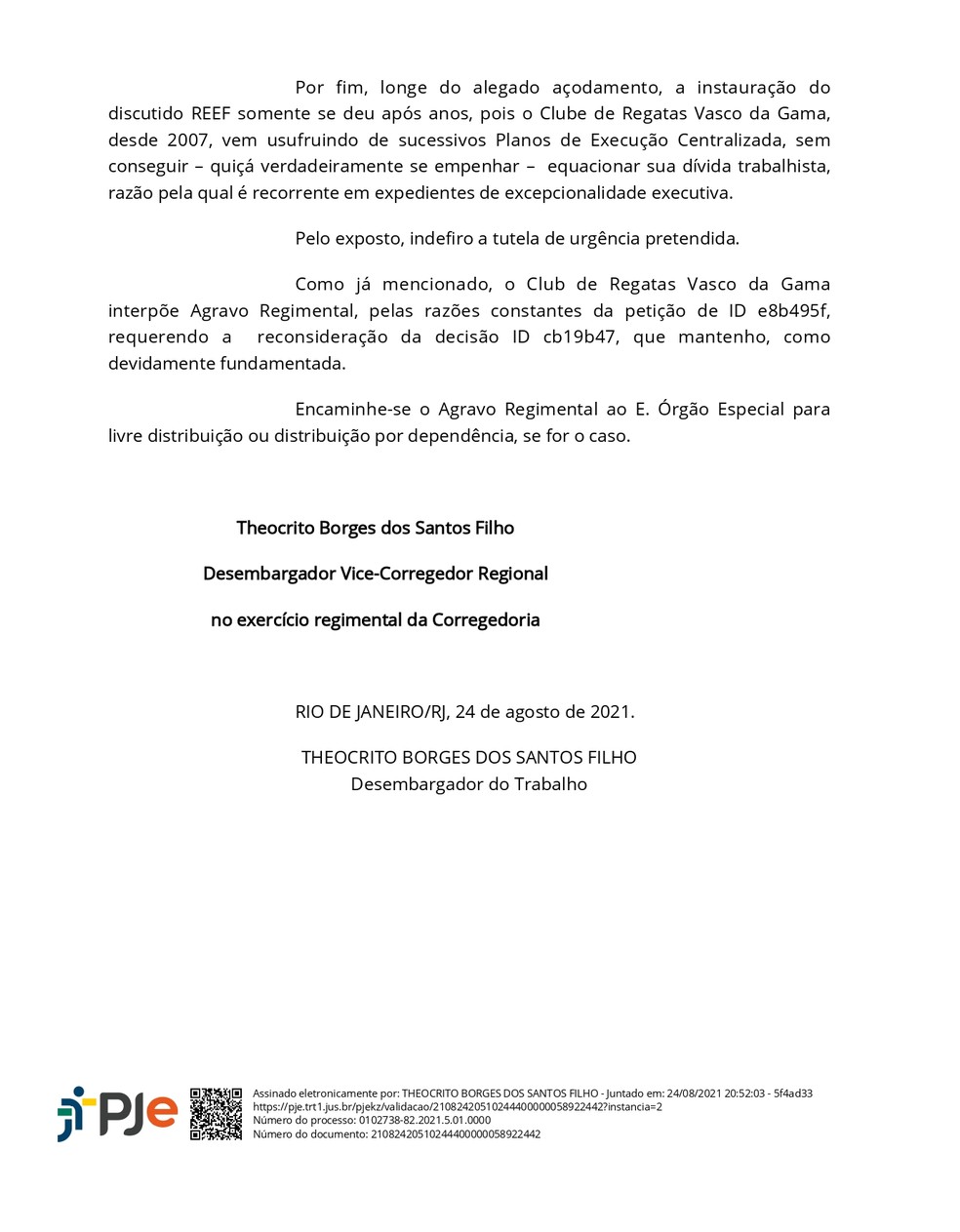 Ainda na decisão proferida nesta quarta-feira, o desembargador vice-corregedor regional do Tribunal Regional do Trabalho da 1ª Região (TRT-1), contestou a possibilidade de concessão do direito ao RCE (Regime Centralizado de Execuções) ao Vasco.