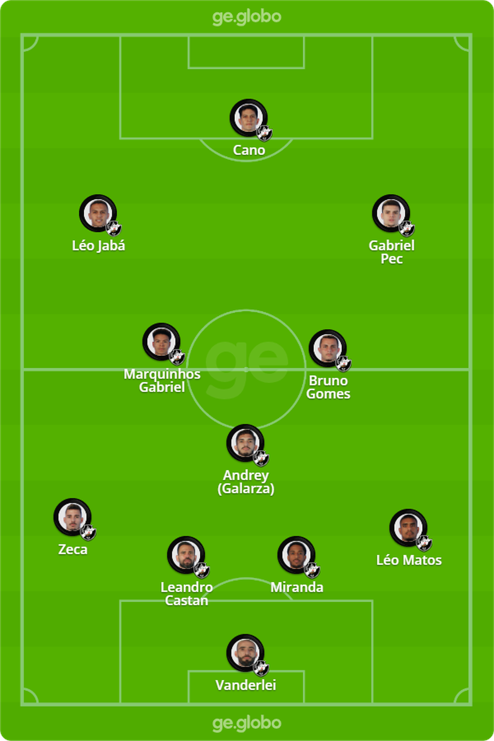 Provável escalação: Vanderlei, Léo Matos, Miranda, Leandro Castan e Zeca; Andrey (Galarza), Bruno Gomes e Marquinhos Gabriel; Léo Jabá, Gabriel Pec e Cano.
