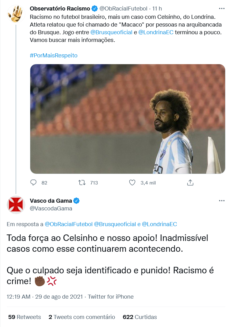 Fonte: Twitter Observatório Racismo, Twitter oficial do Vasco