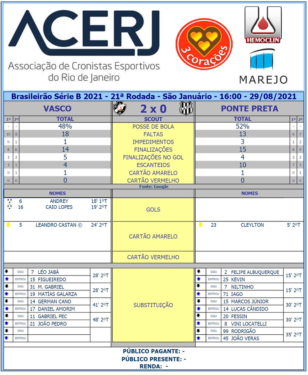 O Vasco se recuperou na Série B e venceu por 2 a 0 a Ponte Preta, neste domingo, em São Januário. Com o resultado, os cruzmaltinos chegaram a 31 pontos e voltam a mirar uma aproximação do G-4. Já os paulistas, com 22, seguem perto da zona de rebaixamento.