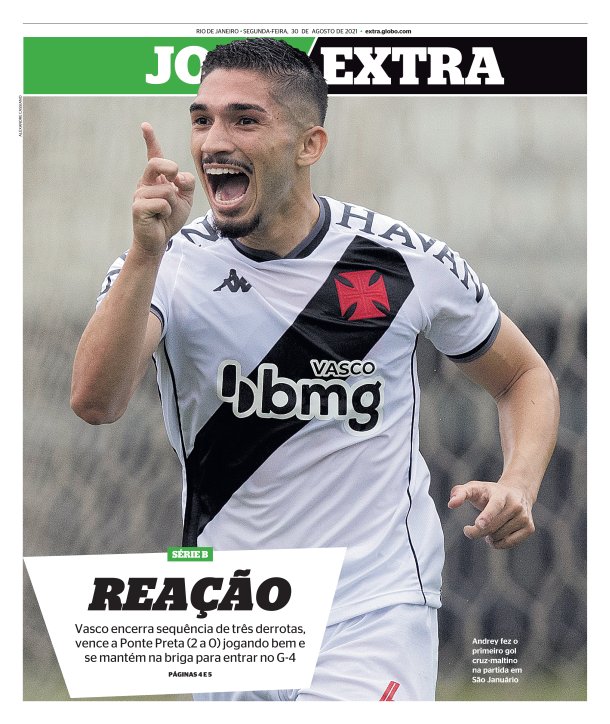 Pelo Brasileiro da Série B, o Vasco derrotou a Ponte Preta por 2 a 0 no último domingo em São Januário, encerrando uma série de 3 derrotas. Veja as capas dos jornais.
