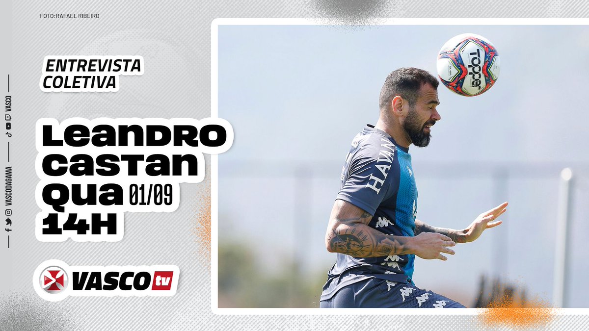Nesta quarta-feira, às 14h, teremos entrevista coletiva com o capitão Leandro Castan, ao vivo, na VascoTV! 💢📺
