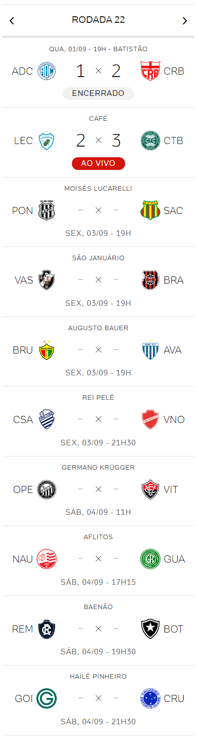 Dois jogos abriram a 22ª rodada do Brasilieiro da Série B nesta 4ª-feira. O CRB venceu o Confiança por 2 a 1 (gol de Tiago Reis, que está emprestado ao time alagoano) e assumiu momentaneamente a liderança da competição, mas, logo a seguir, o Coritiba derrotou o Londrina por 3 a 2 e retomou a primeira posição. O Vasco está em 10º lugar e enfrenta o Brasil de Pelotas na 6ª-feira às 19h em São Januário.