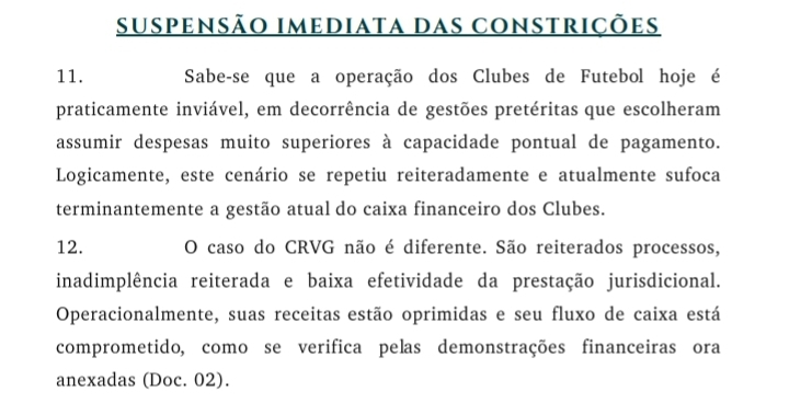 O Esporte News Mundo teve acesso a detalhes do caso. O requerimento do RCE, com base na nova lei do clube-empresa, foi impetrado no TJRJ na última segunda-feira. Na terça-feira, o presidente do Tribunal de declarou suspeito para decidir sobre o pleitos e encaminhou para o primeiro vice-presidente, que deu a decisão às 18h01 desta quarta-feira. Mais de R$ 40 milhões já estão em fase de execução contra o clube na área cível.