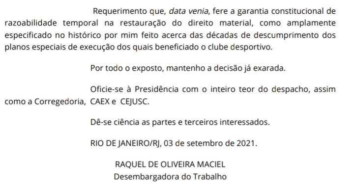 "Soma-se a tanto a necessária urgência da medida por mim adotada, considerando que no processo piloto REEF (…), na data de ontem (02/09/21), foi requerida pelo Club de Regatas Vasco da Gama a imediata transferência de todos os valores depositados e/ou arrestados, o que envolve a garantia dada ao cumprimento do próprio REEF (Id. 7fc75c1 daqueles autos), com evidente potencial para configurar flagrante violação a direitos de trabalhadores que há muito aguardam a satisfação de seus créditos de natureza alimentar, e que envolve uma dívida de R$ 93.000.000,00 (198 é o número de credores já constantes da lista do REEF, quantidade ainda provisória, a se considerar que o prazo para que as Varas do Trabalho informem os credores ainda está em curso)".