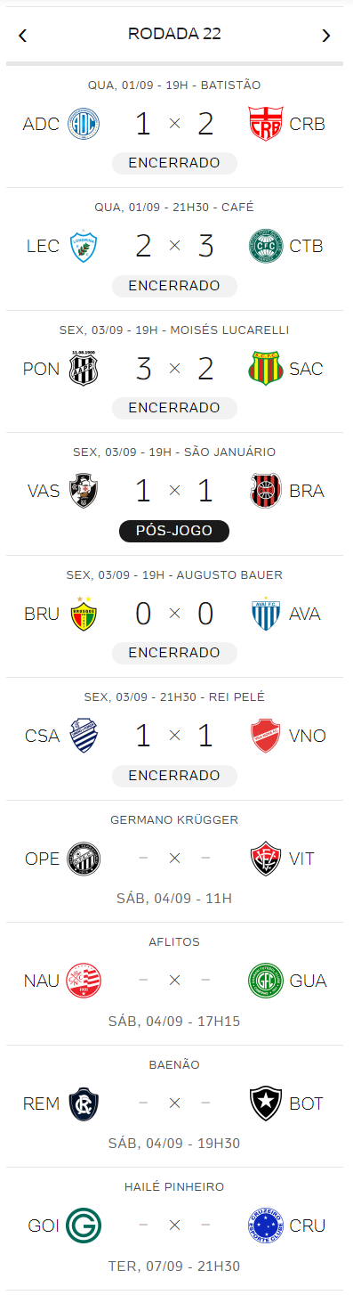 Veja a classificação da Série B após os jogos de 6ª-feira. O Vasco, que empatou por 1 a 1 com o Brasil de Pelotas, está na 9ª posição. Se o Operário pontuar contra o Vitória, o Gigante da Colina fechará a rodada na 10ª colocação.