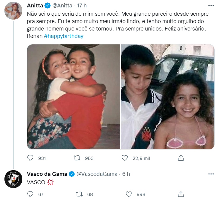Anitta publica foto ainda criança ao lado do irmão vascaíno e Vasco responde