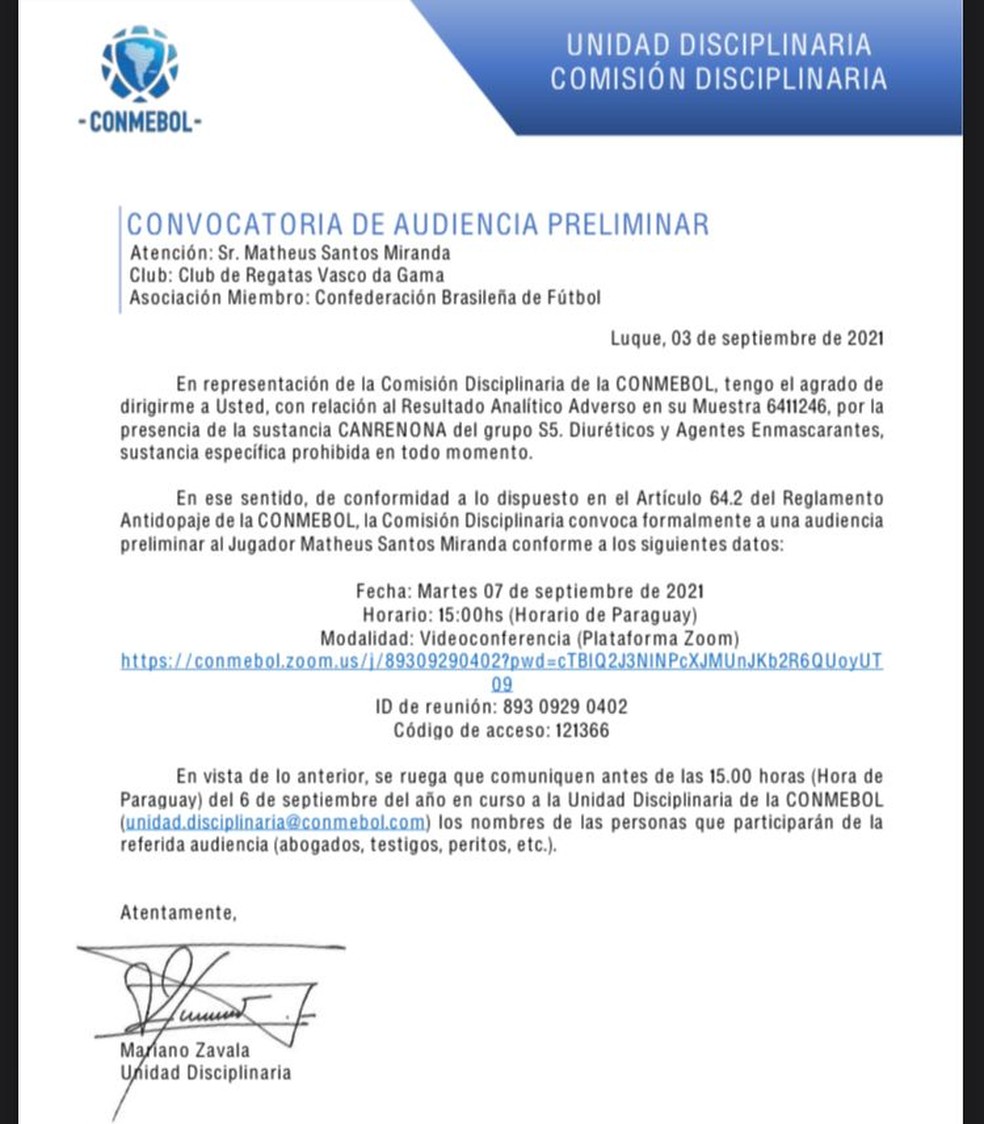 Confira a notificação da Conmebol ao Vasco sobre o exame antidoping de Miranda