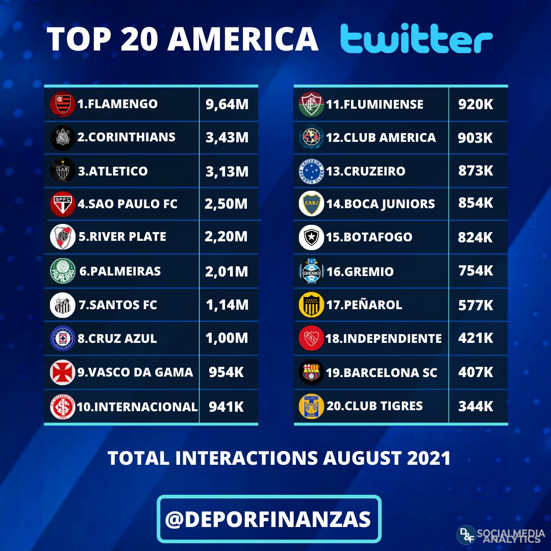 📲⚽ ¡Los 20 clubes de América con más interacciones en #twitter durante agosto 2021! 🔃💙💬