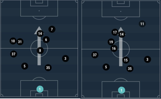 Confira abaixo o mapa de calor e também o posicionamento médio dos jogadores: