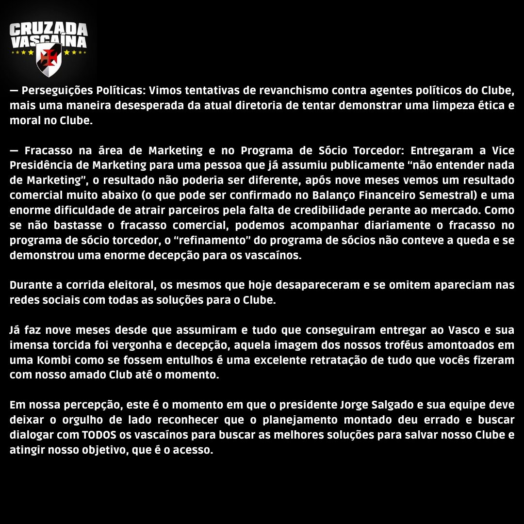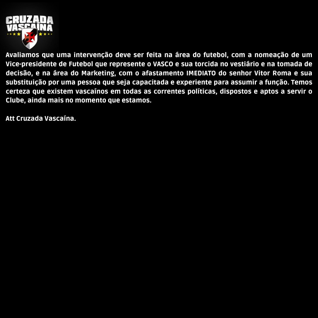 Em nota, Cruzada Vascaína pede nomeação de um VP de futebol e afastamento do VP de marketing
