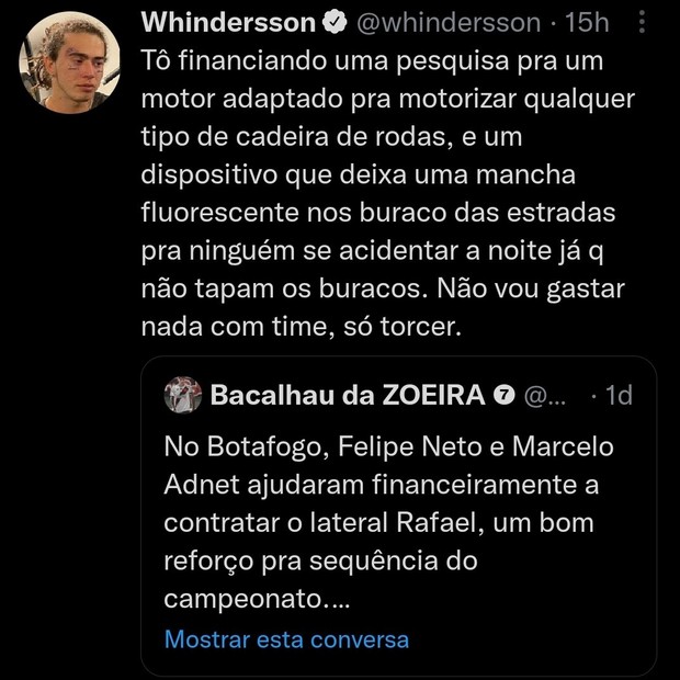 "Tô financiando uma pesquisa pra um motor adaptado pra motorizar qualquer tipo de cadeira de rodas, e um dispositivo que deixa uma mancha fluorescente nos buraco das estradas pra ninguém se acidentar à noite, já que não tapam os buracos. Não vou gastar nada com time, só torcer", respondeu Whindersson.