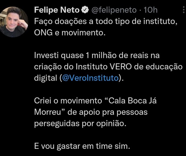 Felipe ainda disse que faz doações a institutos, ONGs, e, mesmo assim, investe no futebol. "Investi quase um milhão de reais na criação do Instituto VERO de educação digital. Criqie o movimento 'Cala a boca já morreu', de apoio para pessoas perseguidas por opnião. E vou gastar em time, sim", disse.