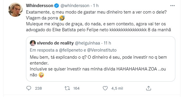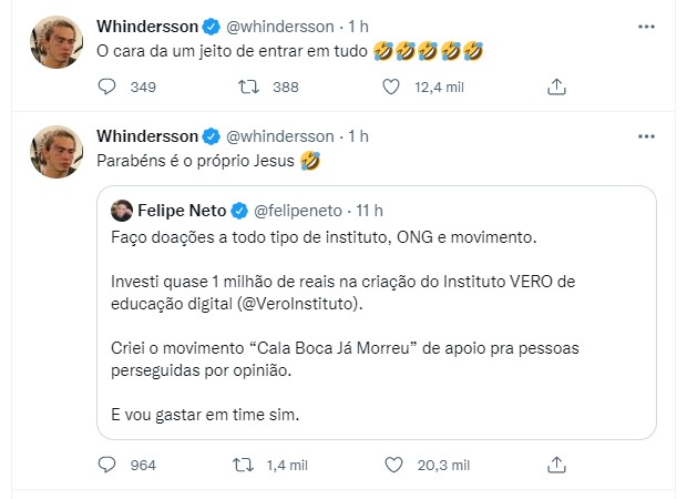 Whindersson não deixou barato e ironizou Felipe. "Parabéns, é o próprio Jesus", brincou, completando que o youtuber tem mania de comprar brigas: "O cara dá um jeito de entrar em tudo".