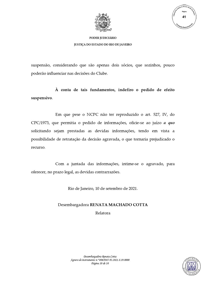 Decisão da desembargadora Renata Machado Cotta, da 3ª Câmara Cível do TJ/RJ, indeferiu pedido do Vasco de tentar mais uma vez excluir Roberto Monteiro e Edmílson Valentim do quadro social do Vasco. Expulsos em maio, Monteiro e Valentim voltaram ao quadro em agosto. #gevas