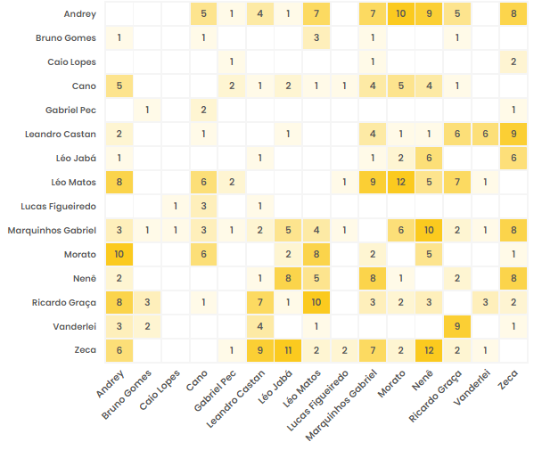 Agora, aproveito para trazer o mapa de interação de passes na partida de ontem: