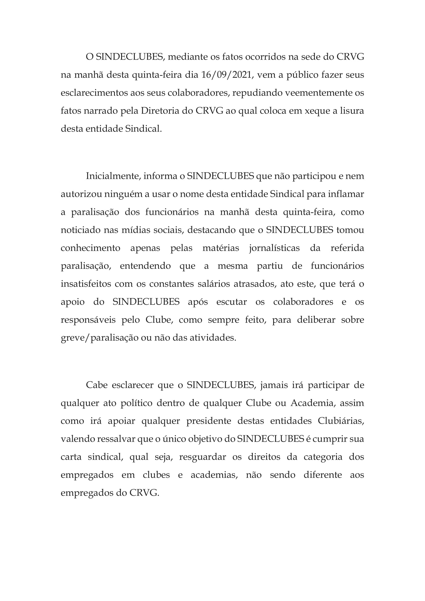 Em nota, Sindeclubes responde manifestação do Vasco sobre paralisação de funcionários