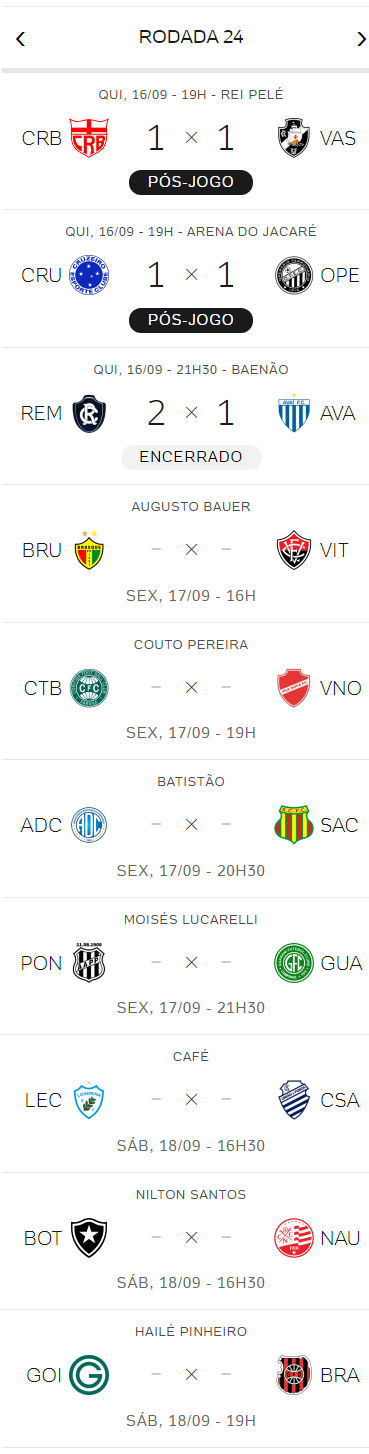 Os quatro jogos desta 6ª-feira pela 24ª rodada do Brasileiro da Série B não alteraram a situação do Vasco. O Gigante da Colina segue em 10º lugar e a 8 pontos do G4.