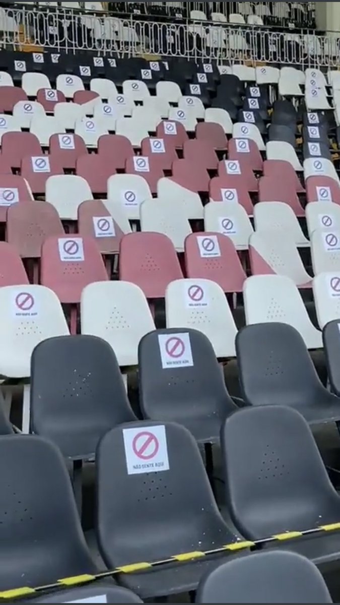 Assentos do setor Social de São Januário são demarcados para a partida de logo mais, respeitando o distanciamento.