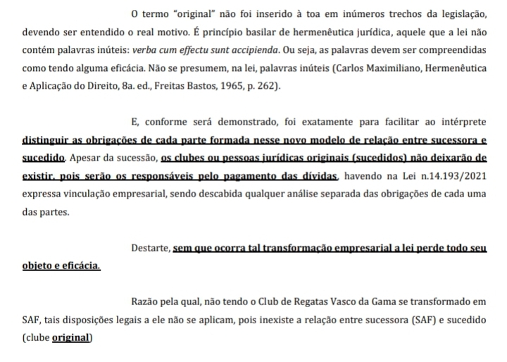Ao longo de 19 páginas, a empresa usou como argumentação, principalmente, a necessidade de análise pelos magistrados do escopo da criação da nova lei do clube-empresa. Foi apresentado o relatório legislativo da lavra do senador Carlos Francisco Portinho (PL/RJ), relator do projeto de lei nº 5516/2019, que deu origem a lei para rebater pontos que fariam o Vasco não ter direito, atualmente, a usar essa lei – como formas da garantia de pagamento da dívida na Sociedade Anônima do Futebol (Saf), necessária a ser criada, no entendimento da empresa.