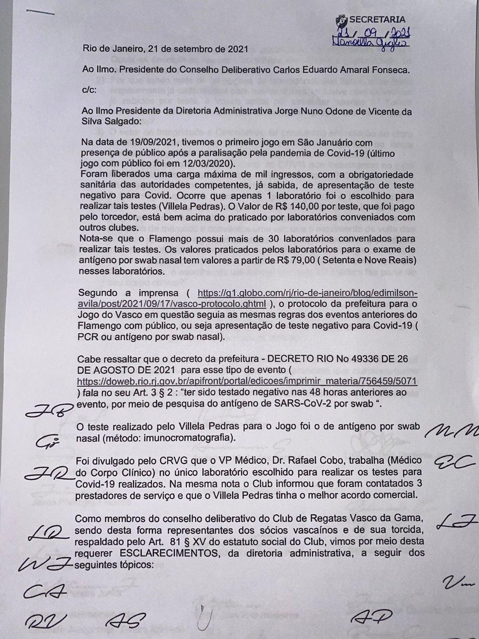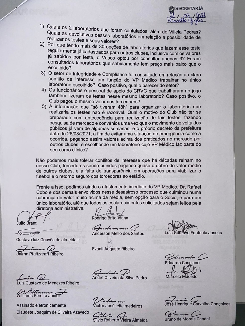 Nesta terça, 17 conselheiros ligados à Sempre Vasco foram à secretaria do clube protocolar um pedido de explicação sobre o caso e pedir também o afastamento do vice-médico Rafael Cobo. Entre os pontos destacados, estão: