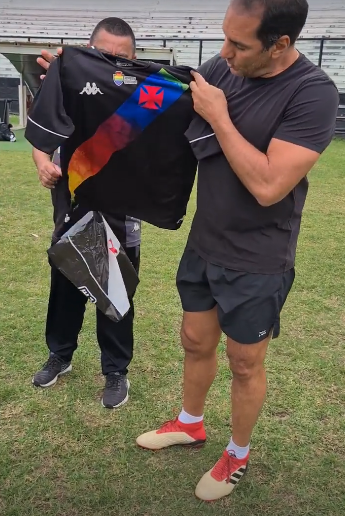 @edmundosouza7 esteve em São Januário gravando com @fred_b12 , e recebeu alguns presentinhos do clube: