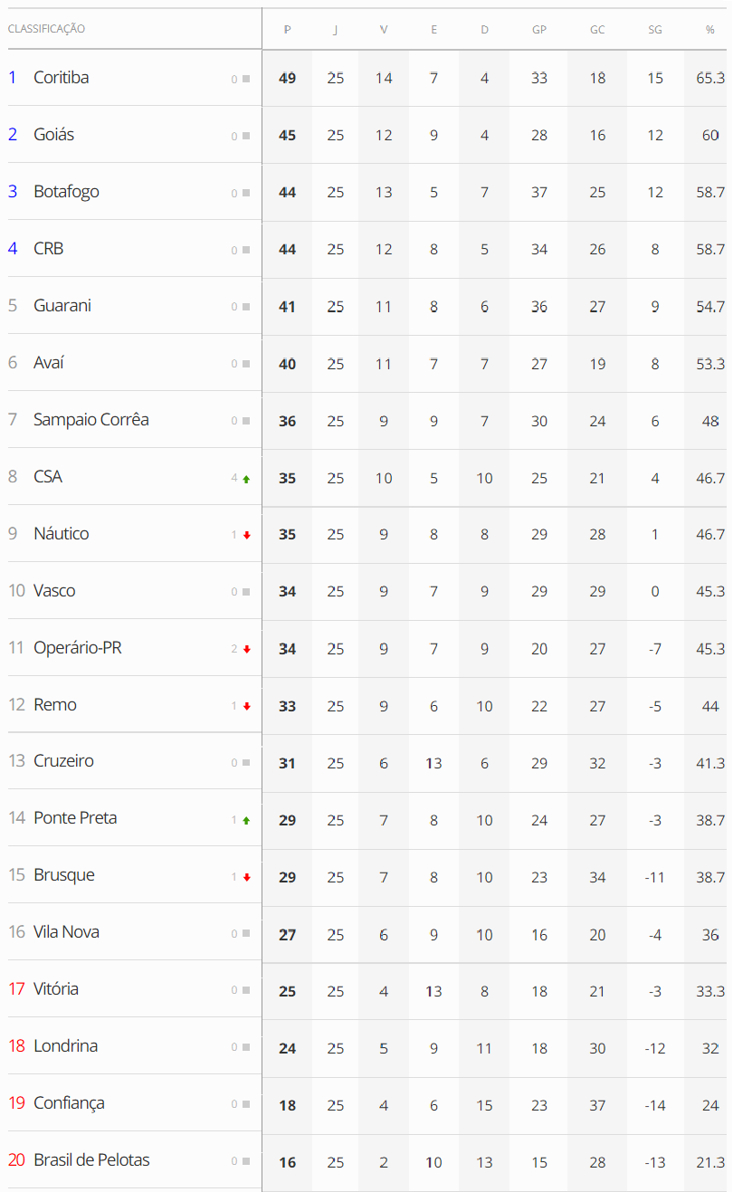 Terminada a 25ª rodada do Brasileiro da Série B, o Vasco, que empatou com o Cruzeiro por 1 a 1, está na 10ª colocação. O Gigante da Colina está a 10 pontos do G4 (zona do acesso à Série A) e a 9 pontos do Z4 (zona de rebaizamento à Série C).
