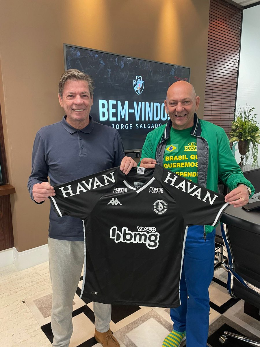 Jorge Salgado posa para foto com Luciano Hang, dono da Havan, patrocinadora do Vasco, em Brusque; veja