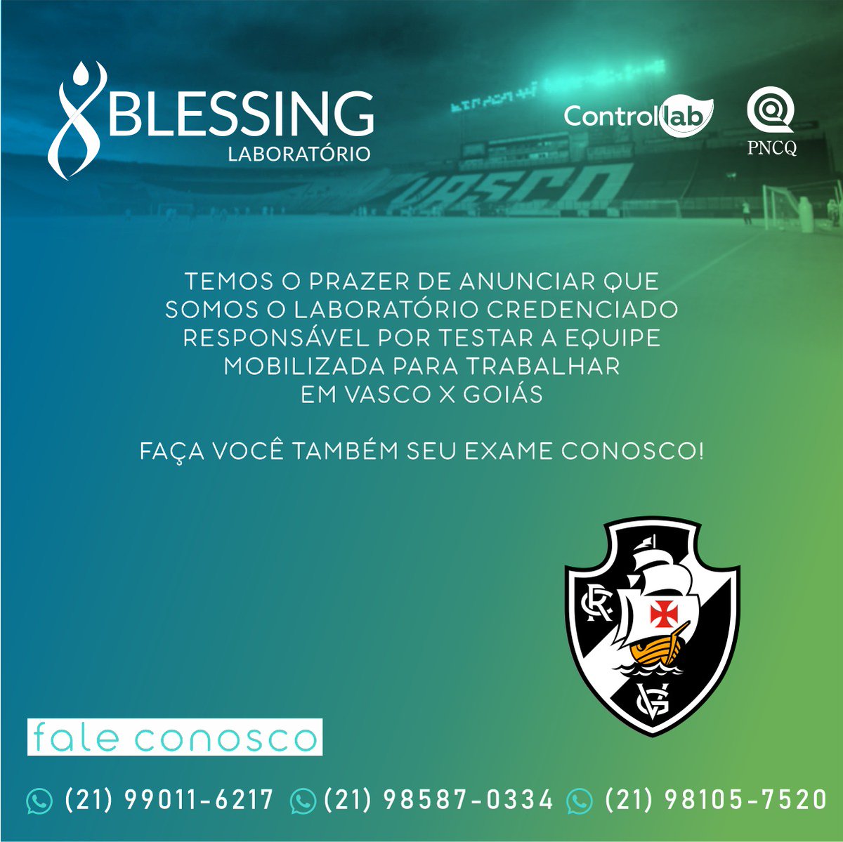 O laboratório Blessing será o responsável pelos testes dos nossos funcionários para a partida Vasco x Goiás, o mesmo também está credenciado para você fazer seu teste, torcedor.