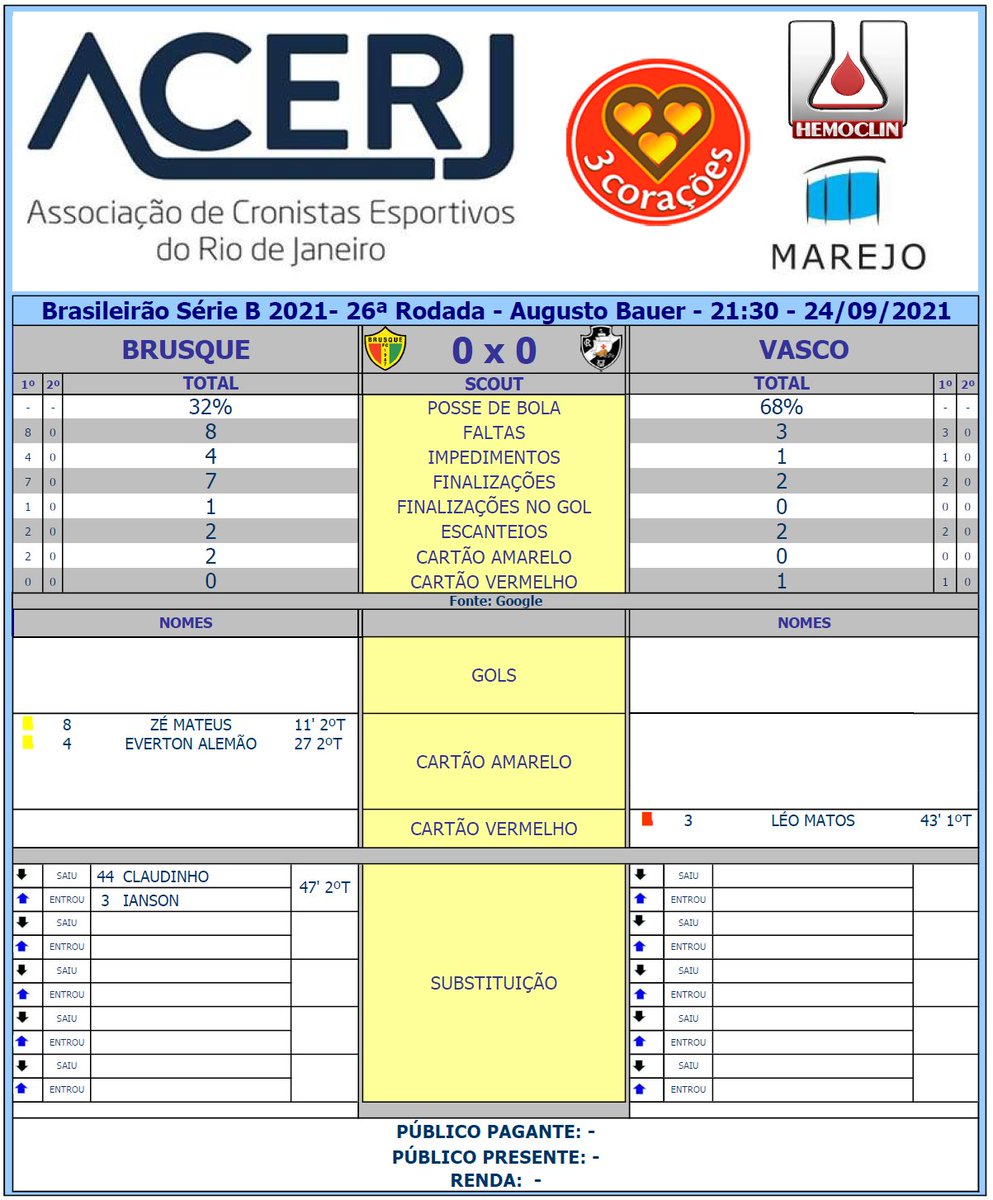 Scout do 1º Tempo de Brusque e Vasco pela 26ª Rodada do Campeonato Brasileiro da Série B 2021 no Augusto Bauer (Fonte: Google) #BrasileiraoSerieB #acerjinforma #BRUxVAS #Vasco #Brusque @BrasileiraoB @Brusqueoficial @VascodaGama