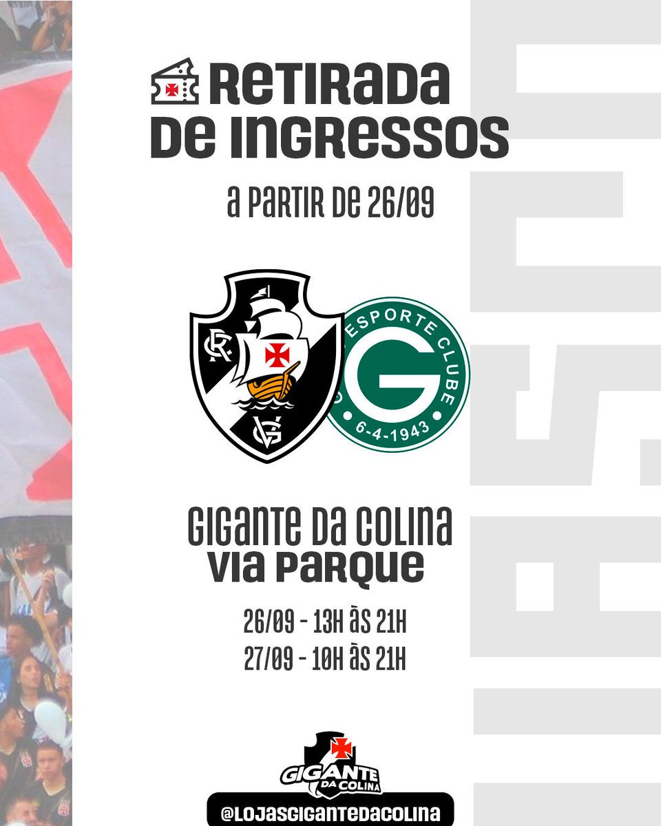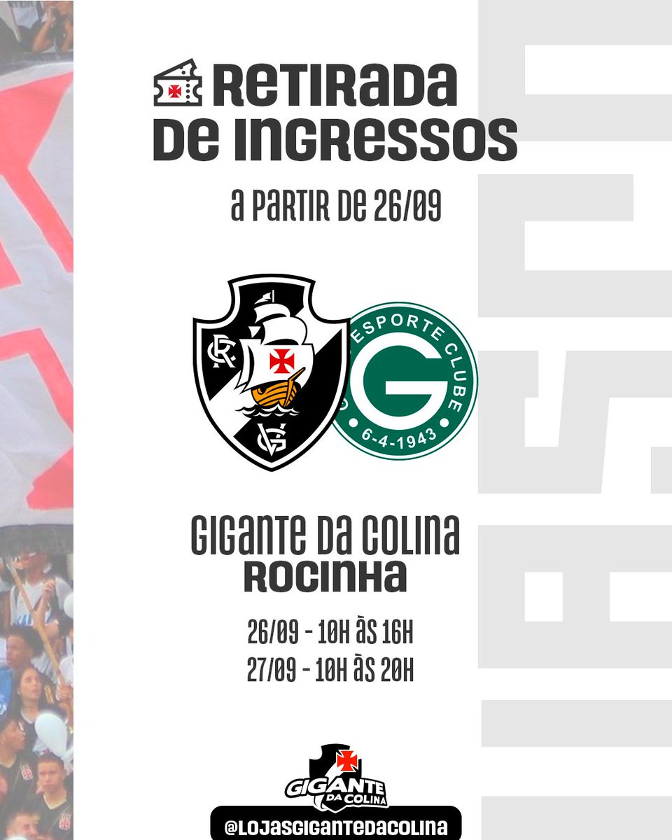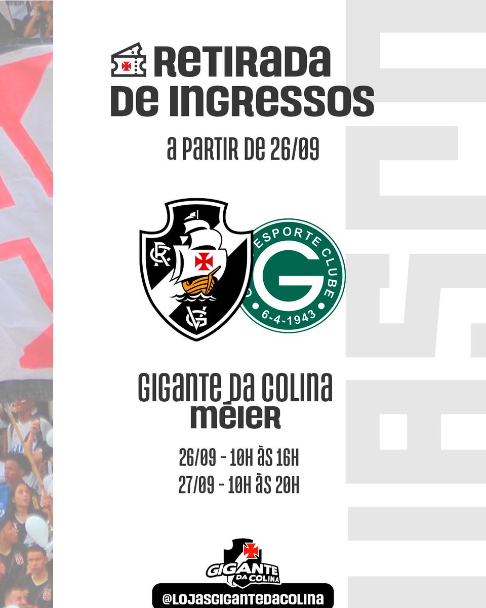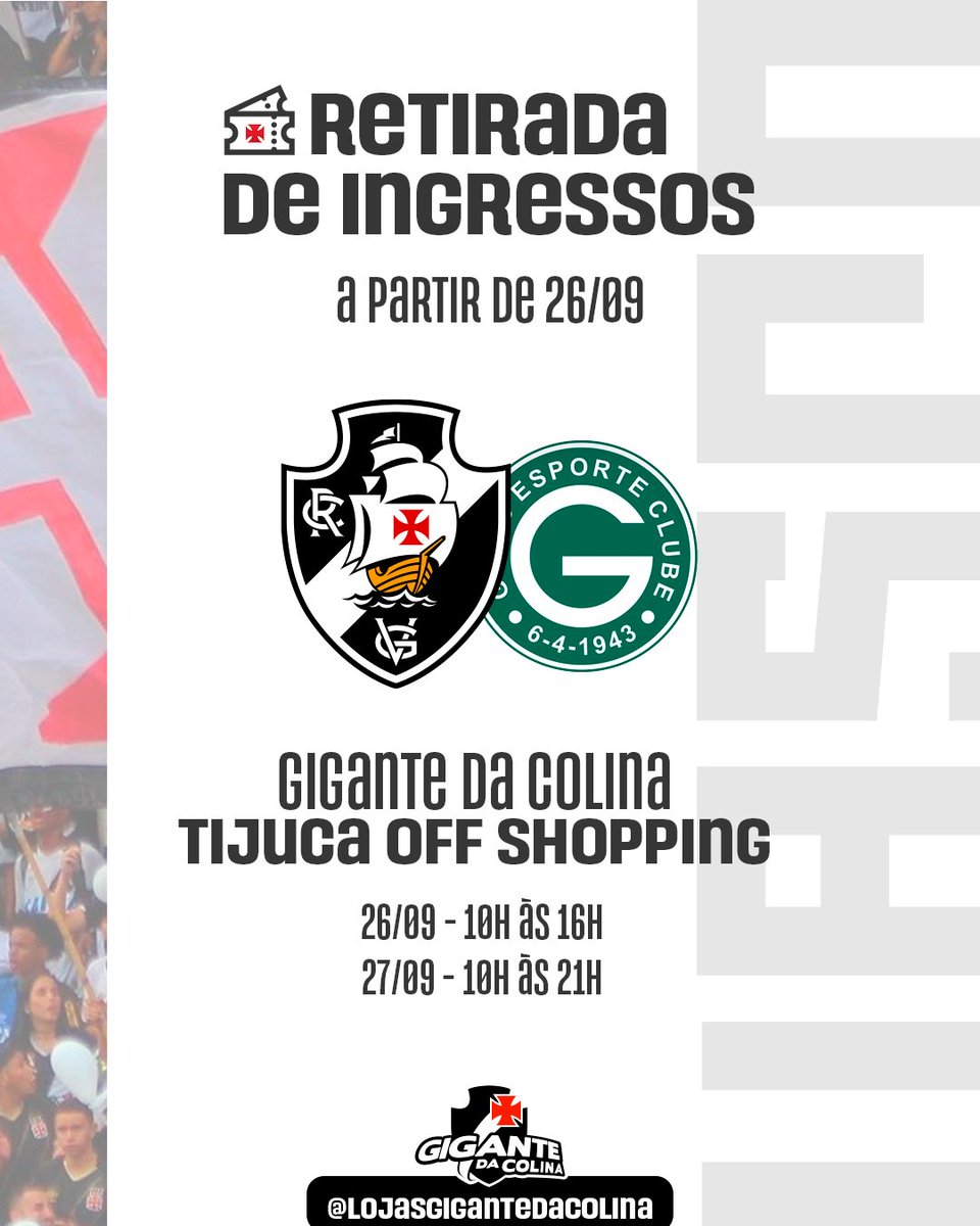 A partir de hoje nas lojas MÉIER, TIJUCA OFF SHOPPING, ROCINHA e VIA PARQUE serão realizadas as retiradas dos ingressos para o jogo VASCO X GOIÁS.