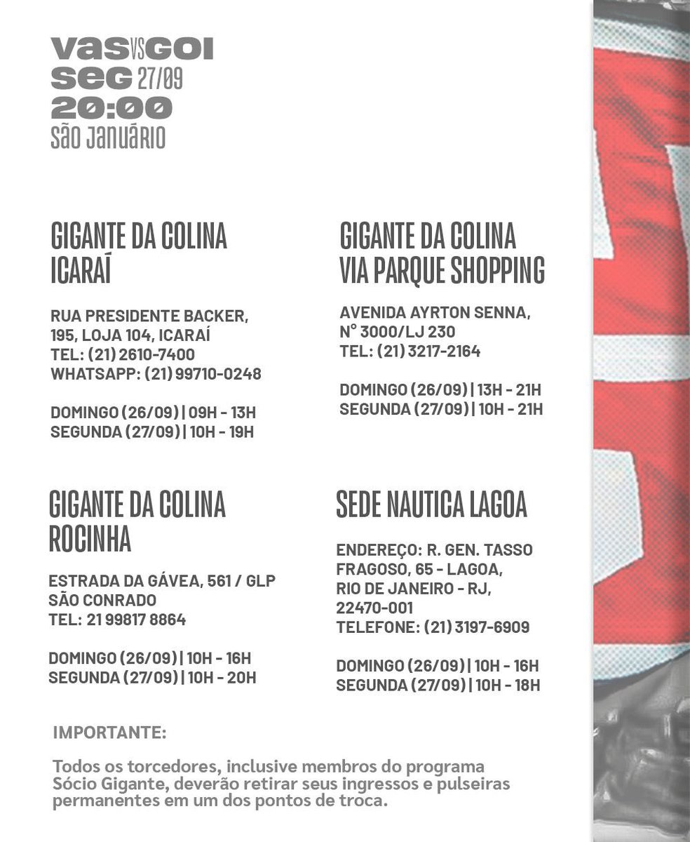3712 ingressos foram emitidos para a partida entre Vasco e Goiás. A venda está encerrada.