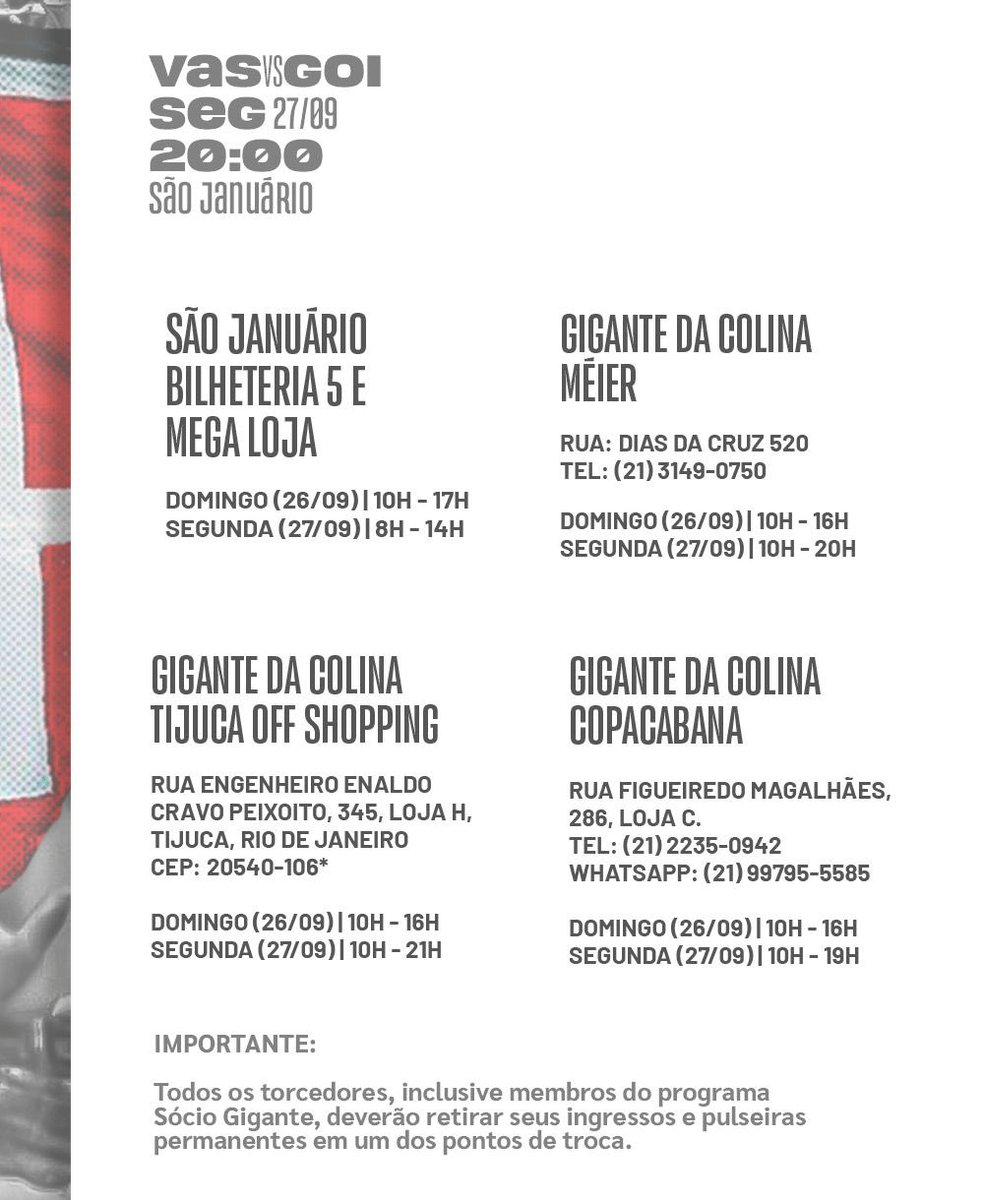 Foram emitidos 3.712 ingressos para Vasco x Goiás