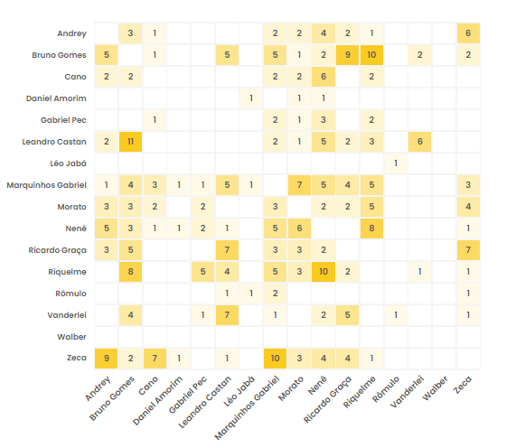 Na 1ª fase da organização ofensiva, chegou a não ter êxito em alguns lances, mas que não geraram grandes chances aos adversários. Os apoios próximos e o jogo de costas são fundamentais para que consiga progredir em campo e manter a posse. Dito isso, trago o mapa de frequência de passes, confira.