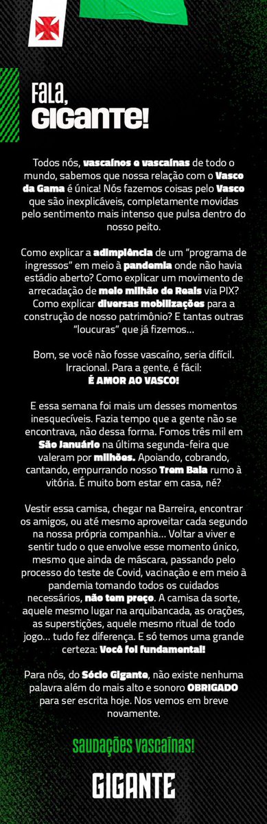 Os sócios-torcedores que estiveram presentes em São Januário, contra o Goiás, receberam esse texto maravilhoso do Vasco! 🥰