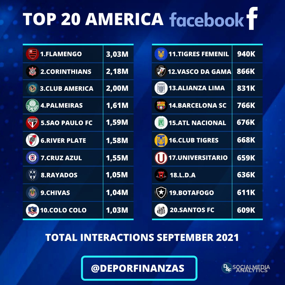 📲⚽ ¡Los 20 clubes de América con más interacciones en facebook durante septiembre 2021!💙👍😀😡😢😮😍⤴💬