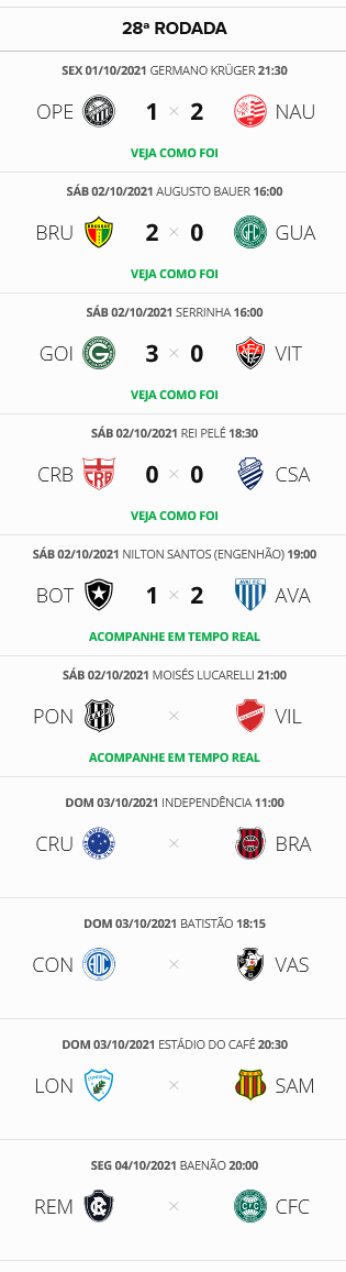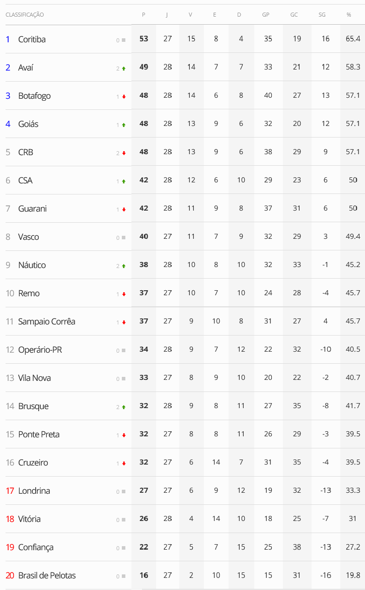 A 28ª rodada do Brasileiro da Série B prossegue neste sábado. Se por um lado a derrota do Guarani e o empate entre CRB e CSA impediram que esses times se distanciassem do Vasco, por outro lado as vitórias de Goiás e Avaí aumentaram para 8 pontos a diferença vascaína para o G4. O jogo que resta deste sábado, Ponte Preta x Vila Nova, não influirá na situação do Vasco. O Gigante da Colina enfrenta o Confiança neste domingo, às 18h15, em Aracaju.