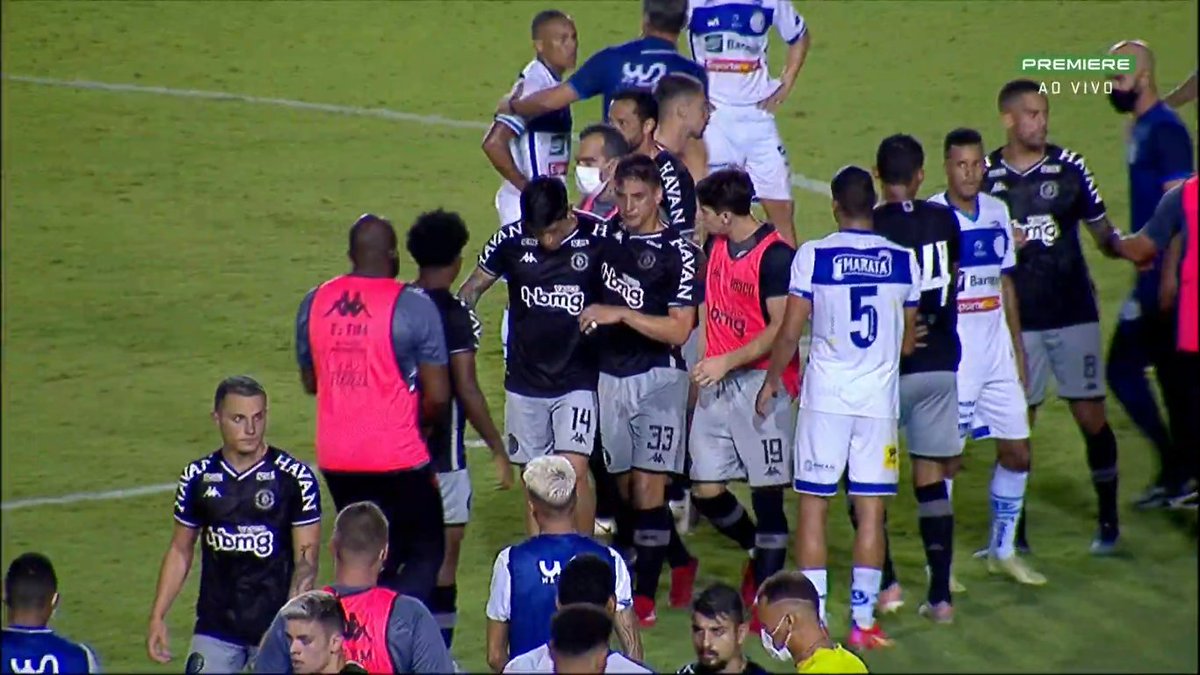 Após jogar os minutos finais com muitas dores, o Sarrafiore sai chorando com ajudas dos companheiros ao fim do jogo.