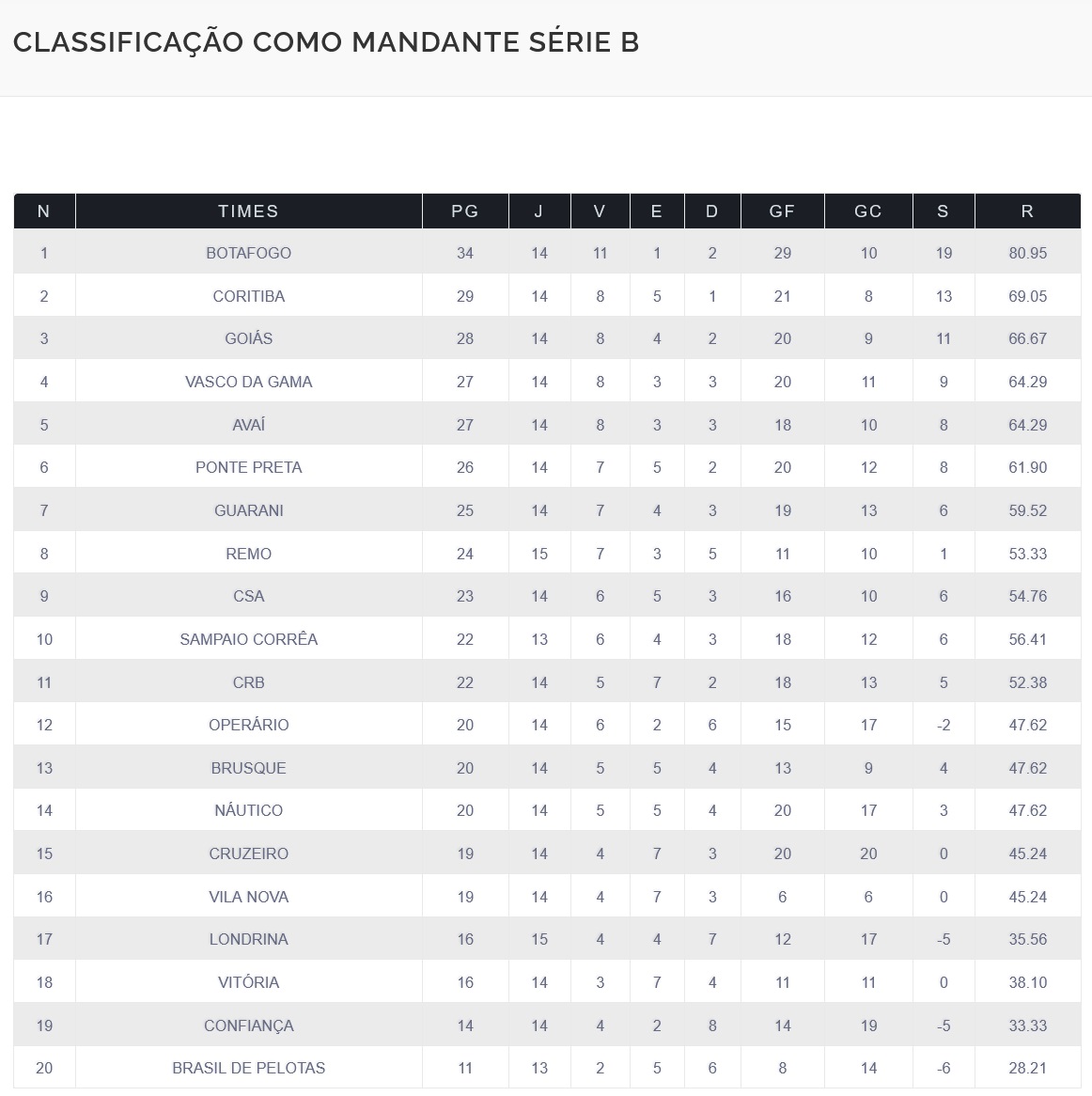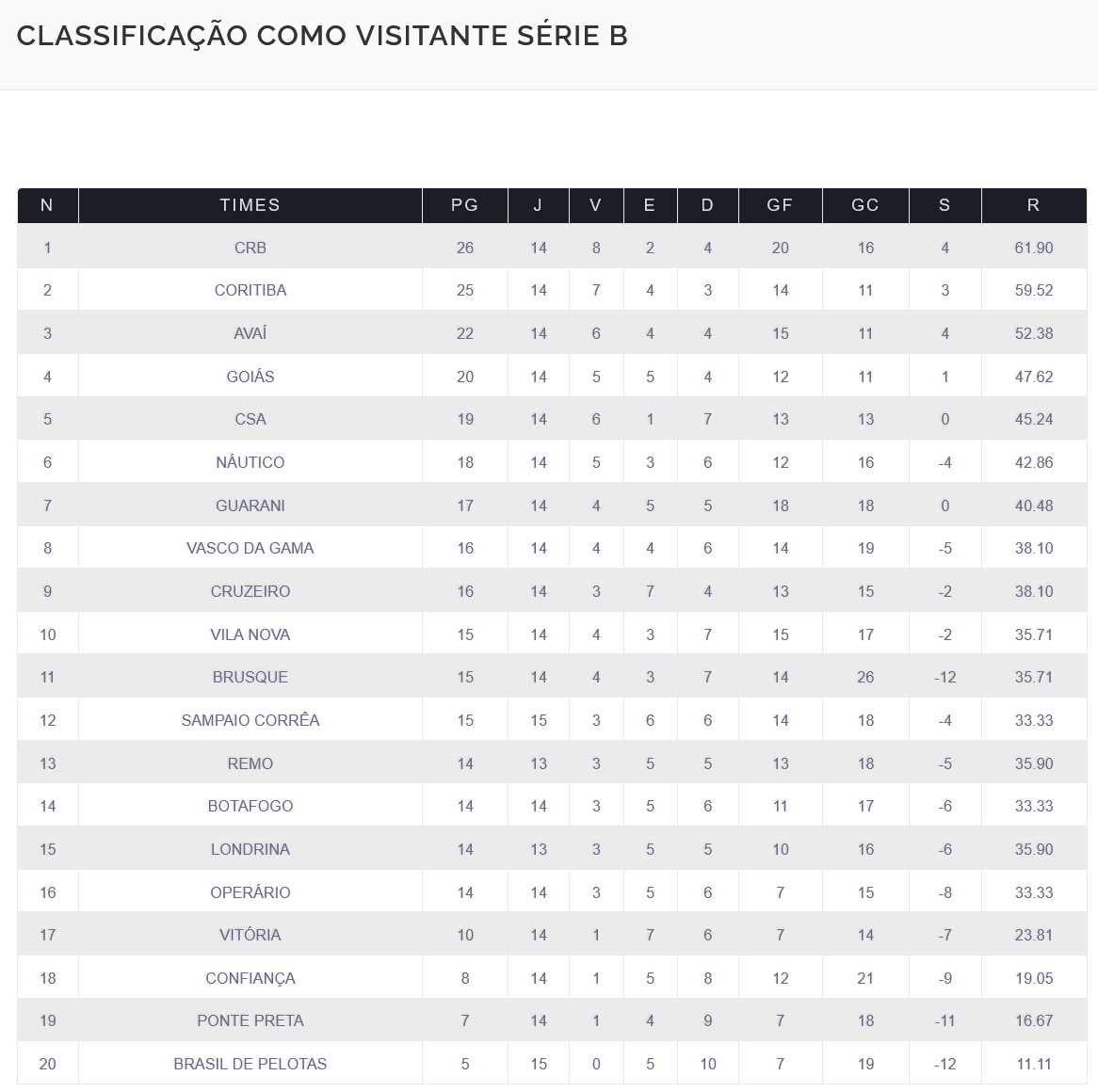 As vitórias fora de casa sobre Brusque e Confiança fizeram o Vasco melhorar classificação do Brasileiro da Série B como visitante. Já como mandante, o Gigante da Colina se mantém em 4º lugar.