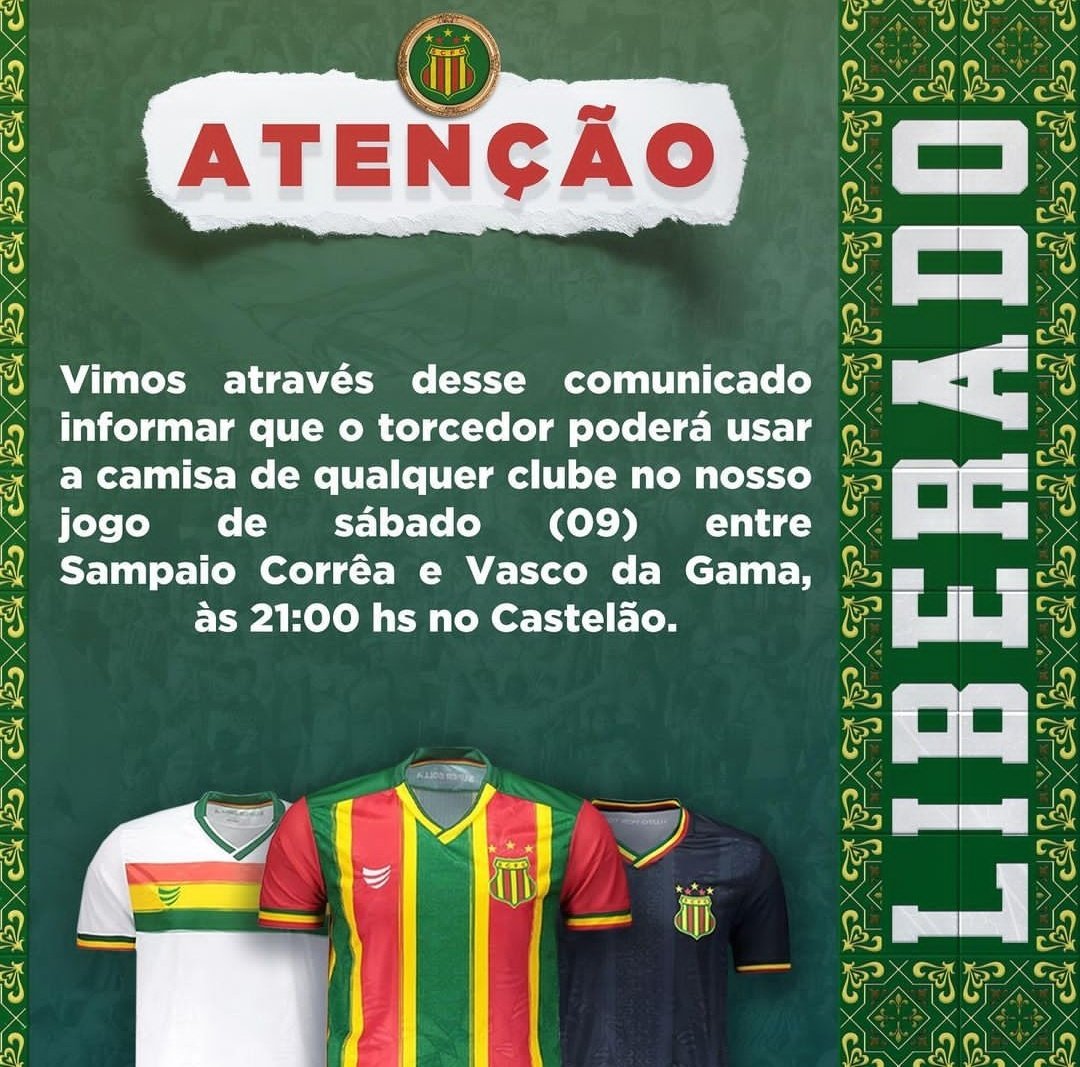 ⚠️ Sampaio Corrêa usou suas redes sociais para informar a liberação do uso de camisas do Vasco no jogo de sábado, no Castelão.