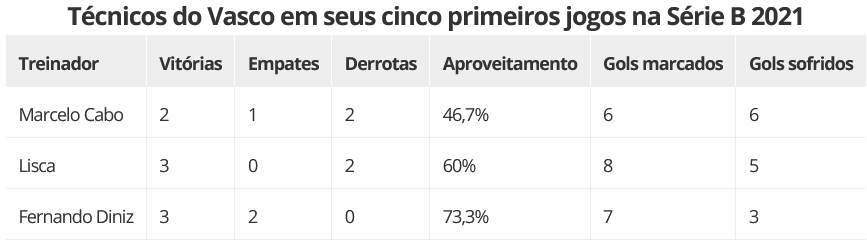 Nos três compromissos posteriores, só vitórias e apenas um gol sofrido. O aproveitamento do treinador é de 73,3%, superior aos de Marcelo Cabo (46,7%) e Lisca (60%) em seus cinco primeiros jogos à frente do Vasco na Série B 2021.